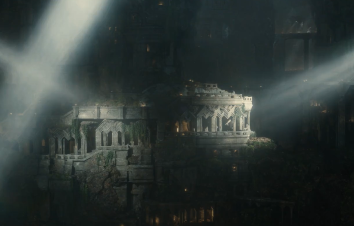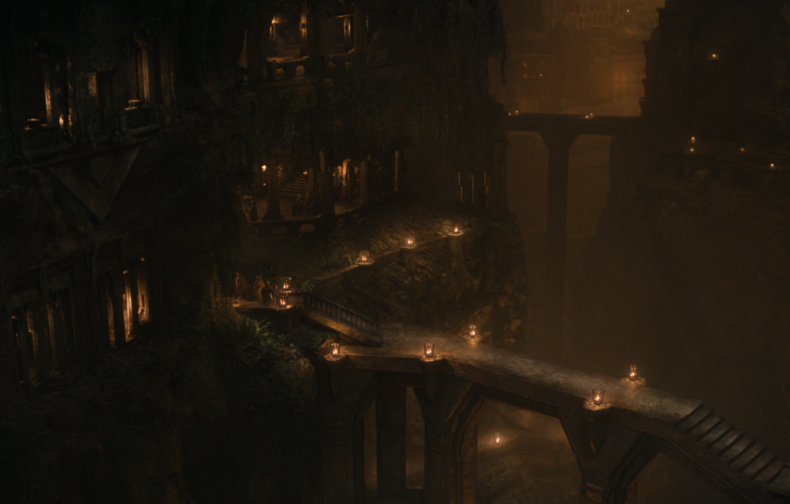Sophisticated lighting systems were developed to replicate the subtle interplay between natural daylight filtering through cracks in the rock and torch-lit shadows, allowing for mood-driven variations that supported each scene’s emotional tone. The result is a Khazad-dûm that is not only larger and more intricate than before, but also alive with geological and architectural realism, fully supporting the epic narrative unfolding within its depths. This work required extensive DMP, CG environment, assets and FX simulations work.