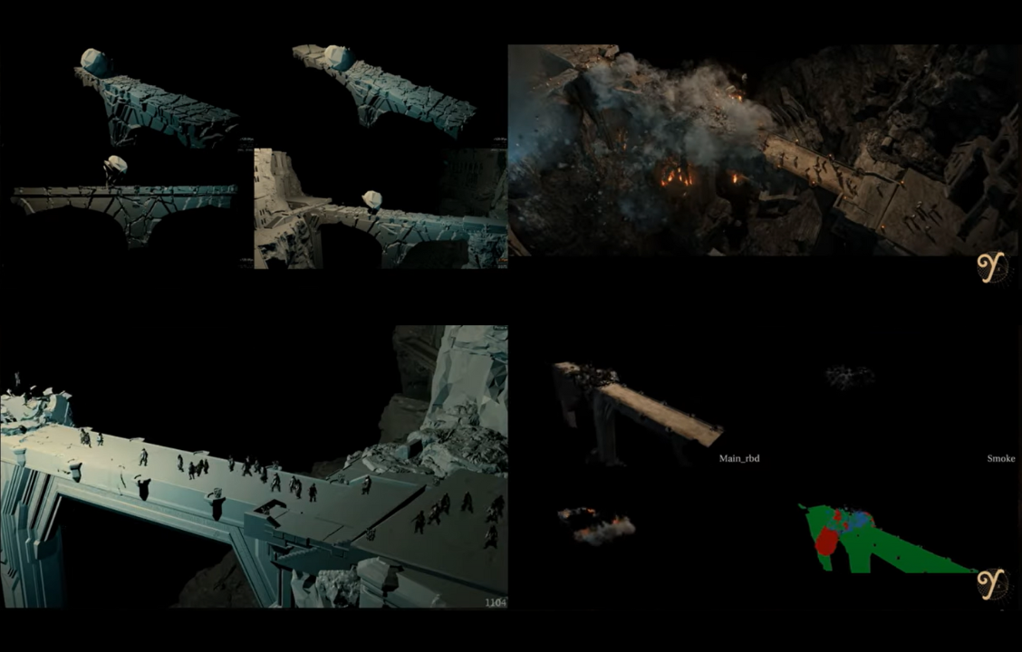 Another critical moment involved the collapse of a towering structure onto a stone bridge, which required detailed simulation of rigid-body art-directed destruction, debris scattering, dust layering, and dynamic light interaction with volumetric effects. The destruction was crafted with close attention to the geological characteristics of the materials, realistically depicting how different densities of rock fracture, collide, and fall.