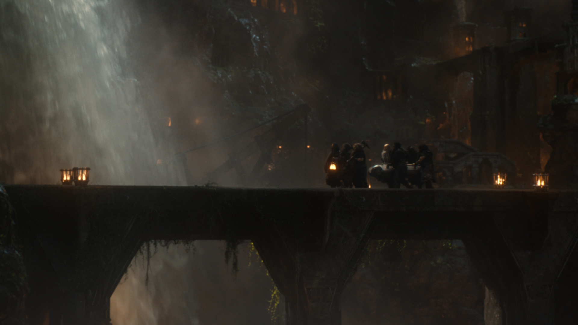 Sophisticated lighting systems were developed to replicate the subtle interplay between natural daylight filtering through cracks in the rock and torch-lit shadows, allowing for mood-driven variations that supported each scene’s emotional tone. The result is a Khazad-dûm that is not only larger and more intricate than before, but also alive with geological and architectural realism, fully supporting the epic narrative unfolding within its depths. This work required extensive DMP, CG environment, assets and FX simulations work.
