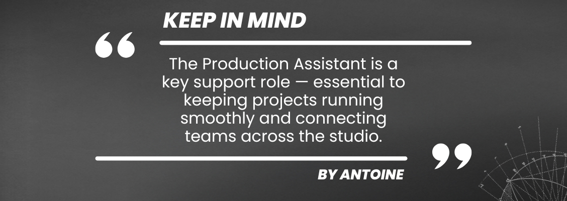 If I had to sum it up, I’d say the Production Assistant is first and foremost a support role — one that’s essential to keeping a project running smoothly and involves working closely with many different people across the studio, from producers and supervisors to IT. It’s a vital position for ensuring daily production flow.