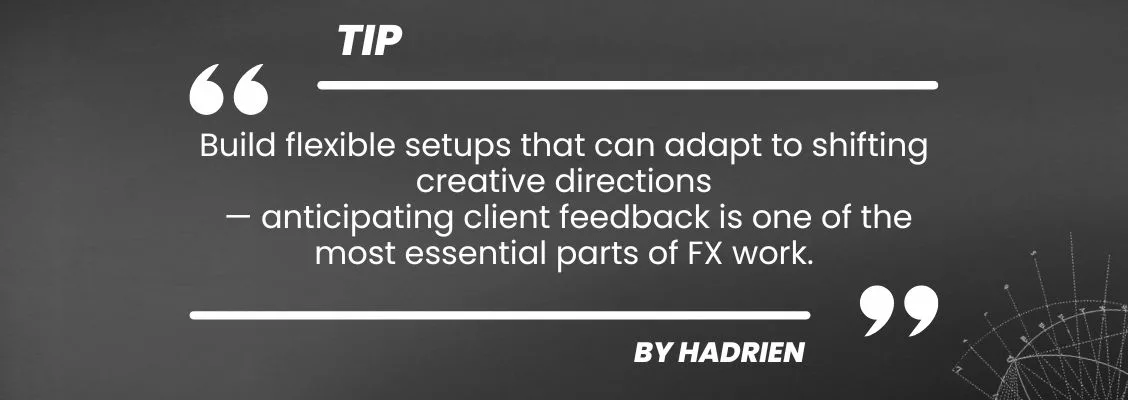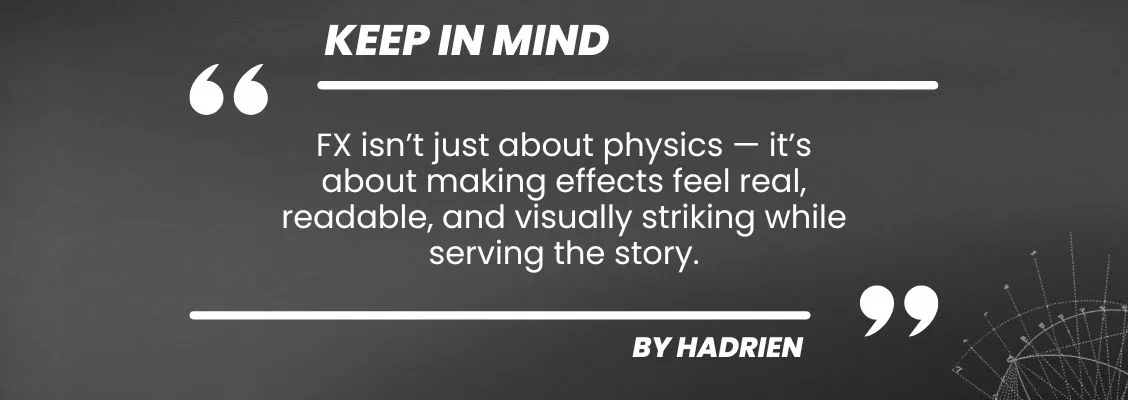 2. Don’t over-specialize, especially with AI entering the industry. Being able to tackle a wide range of FX types — water, fire, destruction, even crowd or CFX — gives you more flexibility between projects. This versatility has helped me stay consistently busy, even during slower periods.