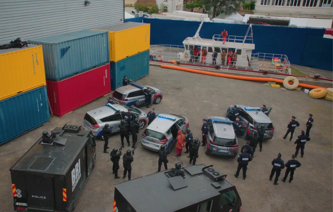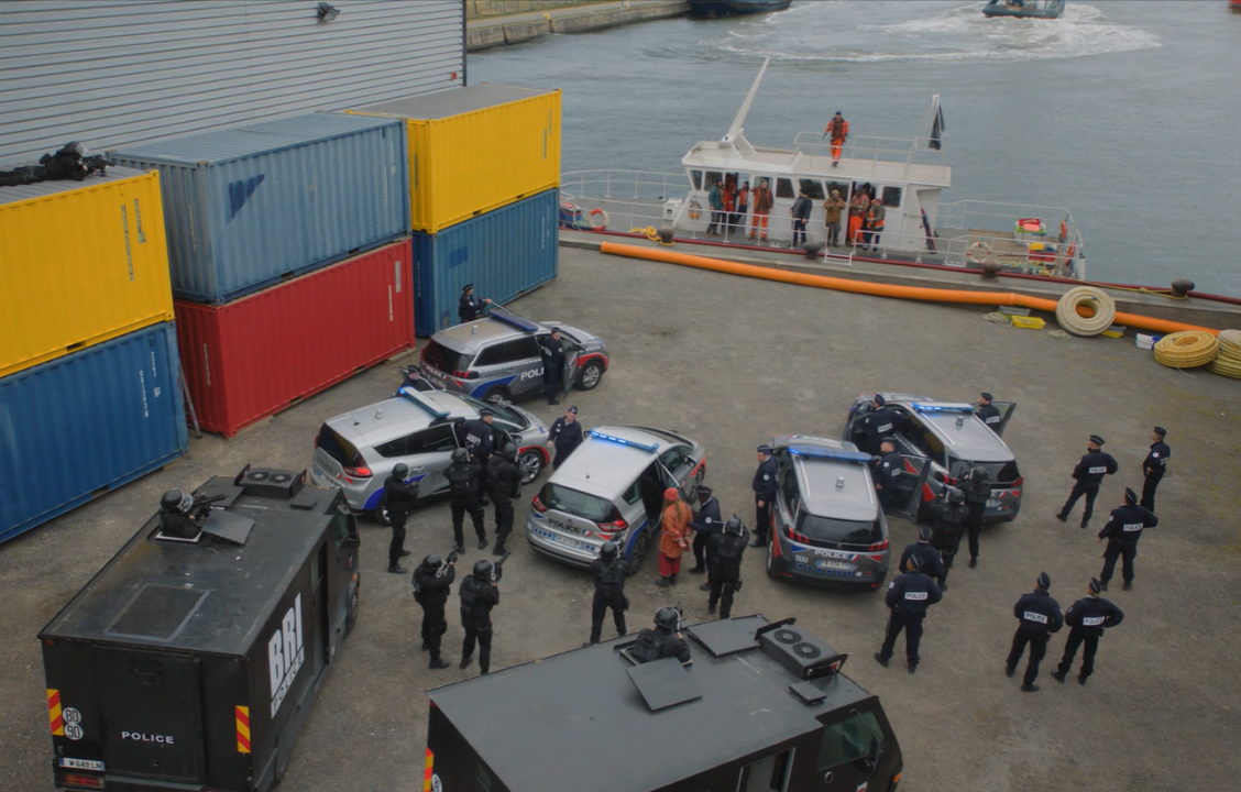 One of the most technically ambitious sequences of the series appears in Episode 1, where a small boat—led by one of the main characters, an Etoile dancer who is also an environmental activist—attempts to intercept and board a massive trawler during a storm at sea. Shot as a continuous Steadicam take in a water tank facility in Belgium, the scene required a seamless fusion of practical effects and digital enhancements to achieve a heightened sense of realism and drama.